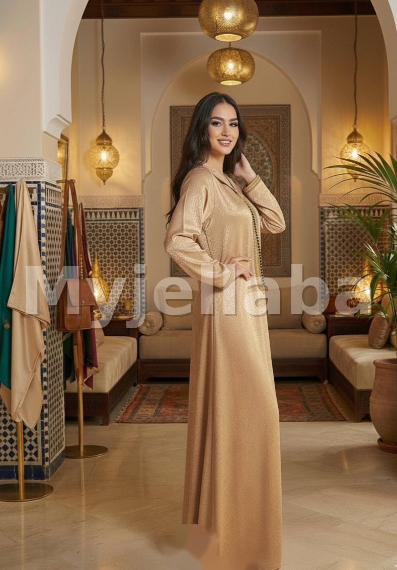 Cette jellaba élégante arbore une couleur dorée riche et des broderies délicates. Le tissu fluide et la coupe ample assurent un confort optimal tout en conservant une allure sophistiquée, idéale pour des occasions spéciales.